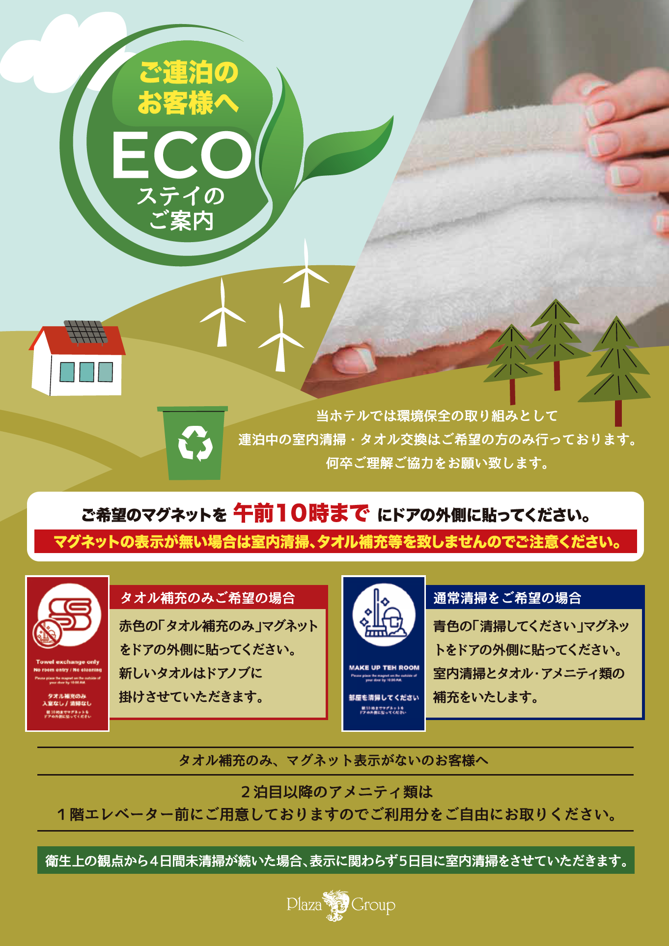 As part of our environmental conservation efforts, room cleaning and towel replacement during your stay will be provided only upon request.